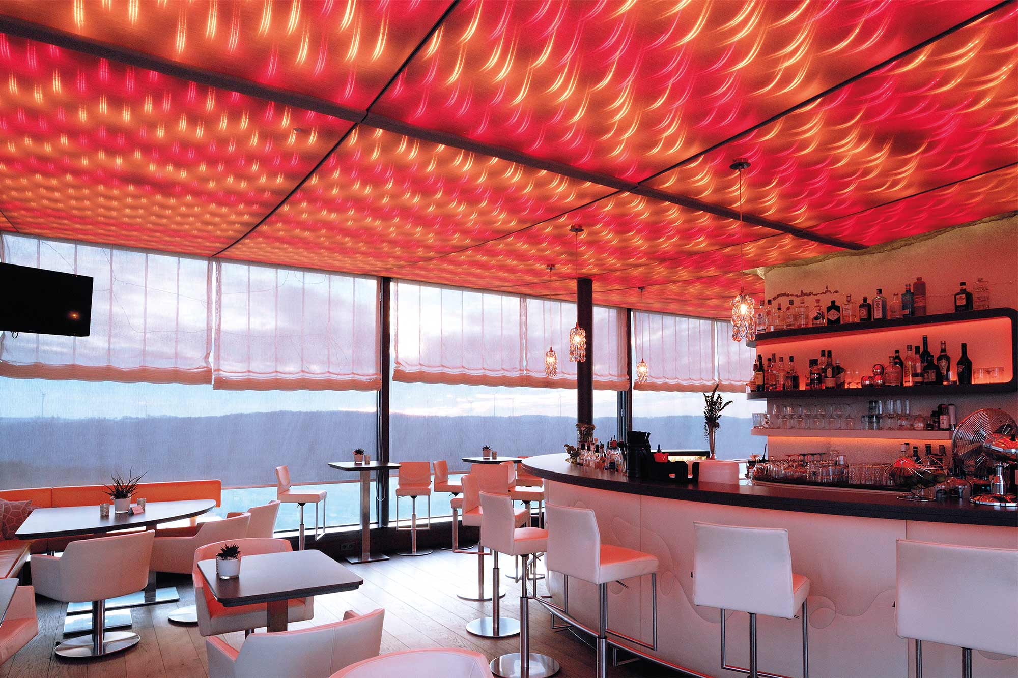 Auch in der Turmbar ist die Decke das optische Highlight. Um die Dynamik der Natur mit Licht nachzuzeichnen, wurden die LED-Pixelstripes mit ihren über 3.500 einzeln ansteuerbaren Pixeln als Matrix angeordnet und von wellenförmigen Gitternetzen halbtransparent bedeckt. Die gestalterischen Möglichkeiten reichen von einer ruhigen Lounge-Atmosphäre bis zu dynamischen Windeffekten.