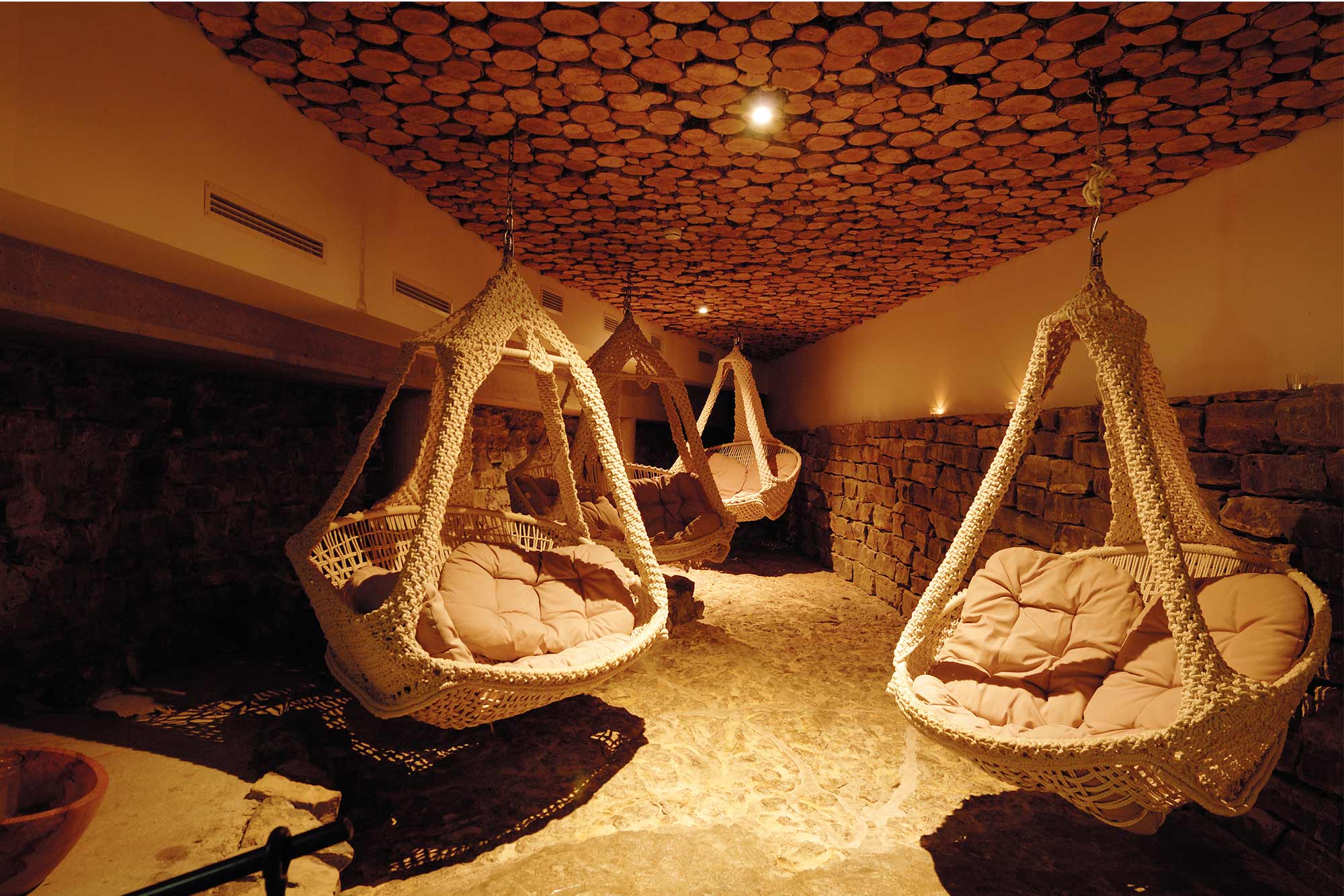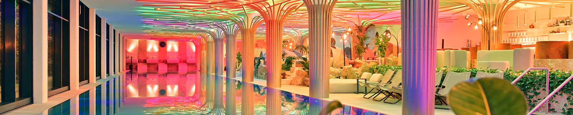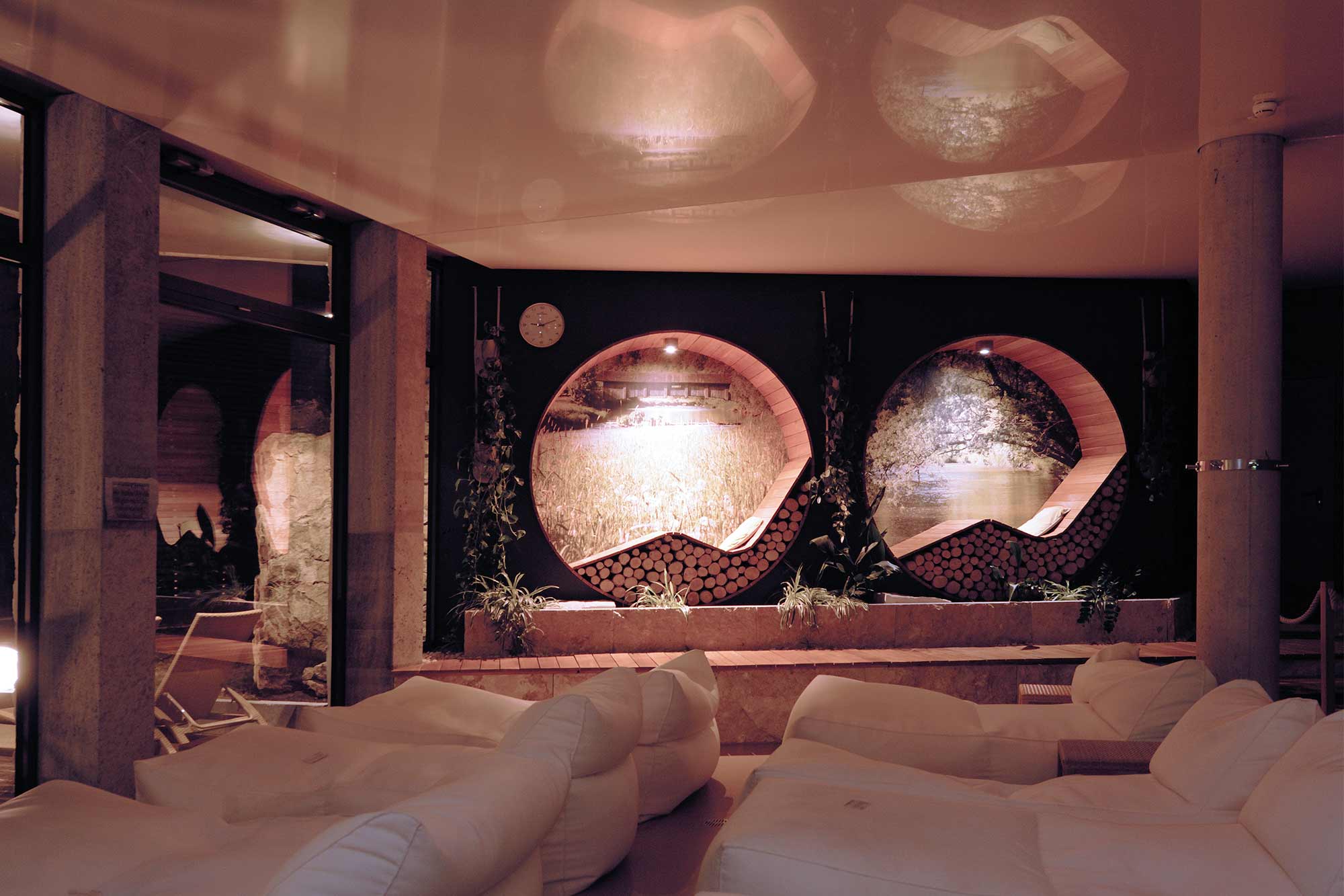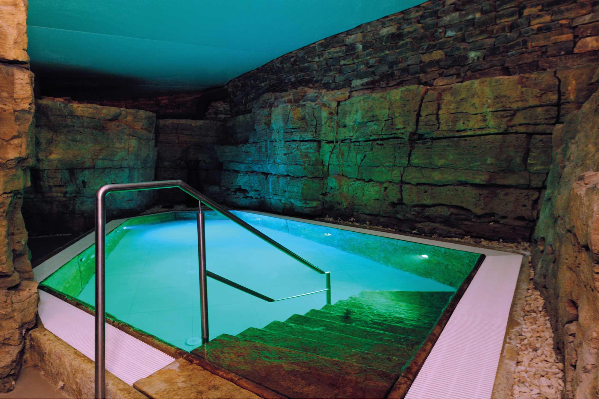 Ganz gleich, wo man sich im 12.000 m2 großen Wellnessareal aufhält – die Detailverliebtheit, mit der die Elemente Licht und Natur integriert wurden, sind außergewöhnlich: von der Solegrotte mit großen Sandsteinen und ihren integrierten LED-Elementen über das in den Fels gehauene Entspannungsbecken mit synchronisierten Unterwasserleuchten bis zur Decke aus Holzstämmen, zwischen denen vereinzelte Downlights sitzen.